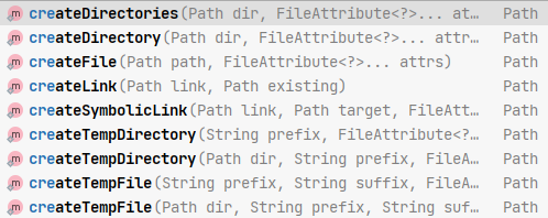 Files.createDirectory() 메서드를 통해서 생성 합니다. Files.create로 시작하는 메서드를 API를 통해서 확인 하면 다음과 같은 메서드가 있습니다,