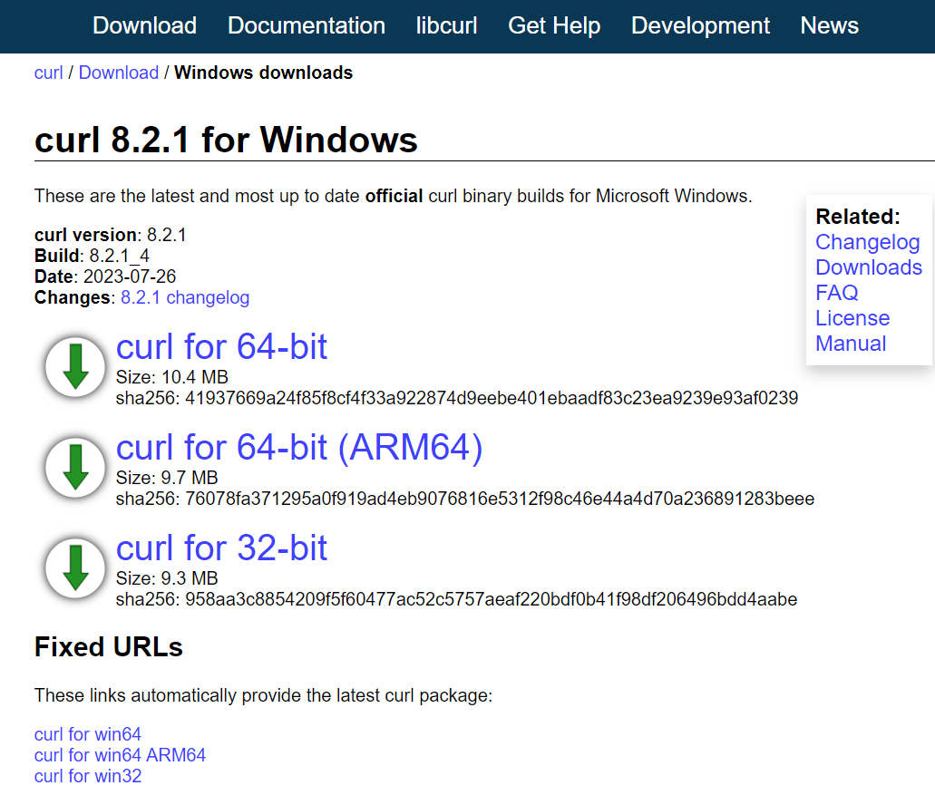 3. cutl 8.2.1 for Windows에서 curl fot 64-bit를 선택 하여 다운로드 받는다.