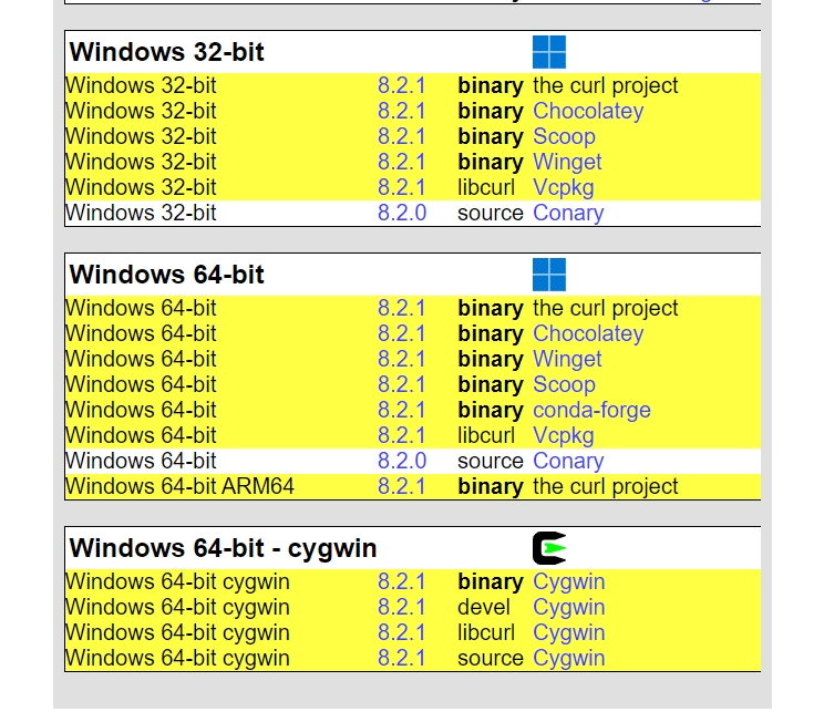 2. Windows 64-bit 8.2.1 binary the curl project 를 선택 한다.